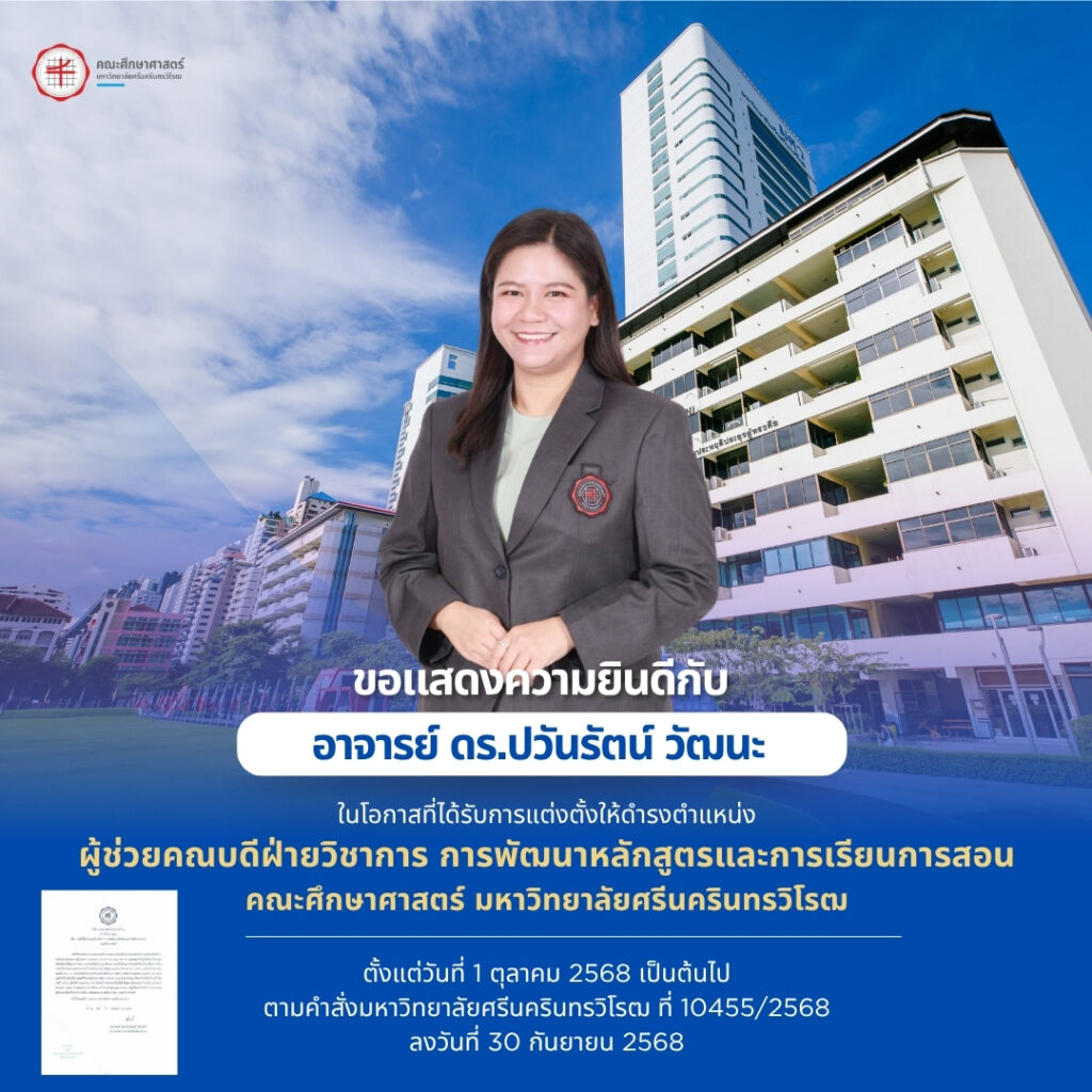 ✨ คณะศึกษาศาสตร์ มหาวิทยาลัยศรีนครินทรวิโรฒ ขอแสดงความยินดีกับ อาจารย์ ดร.ปวันรัตน์ วัฒนะ